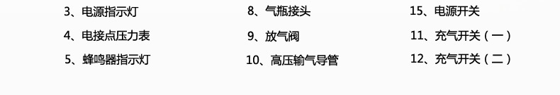 備件 1、外接充氣管(1根) 2、"O"型圈(18*2.4)10個(gè) 3、"O"型圈(12*1.9)5個(gè) 4、壓力表表墊1個(gè) 5、氣瓶轉(zhuǎn)換接頭(G5/8轉(zhuǎn)M22*1.5)1件