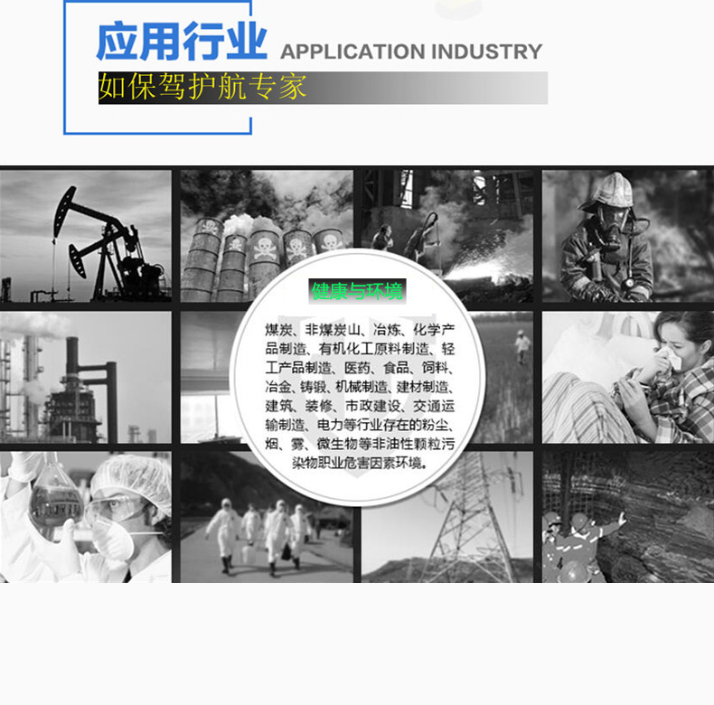 選用推薦:適用于霧霾,面粉加工廠,礦廠(礦物加工粉塵),棉花加工,五金鑄造,汽車尾氣中產(chǎn)生的粉塵和部分有毒氣體環(huán)境可選用濾棉搭配濾毒盒進(jìn)行防護(hù)